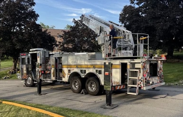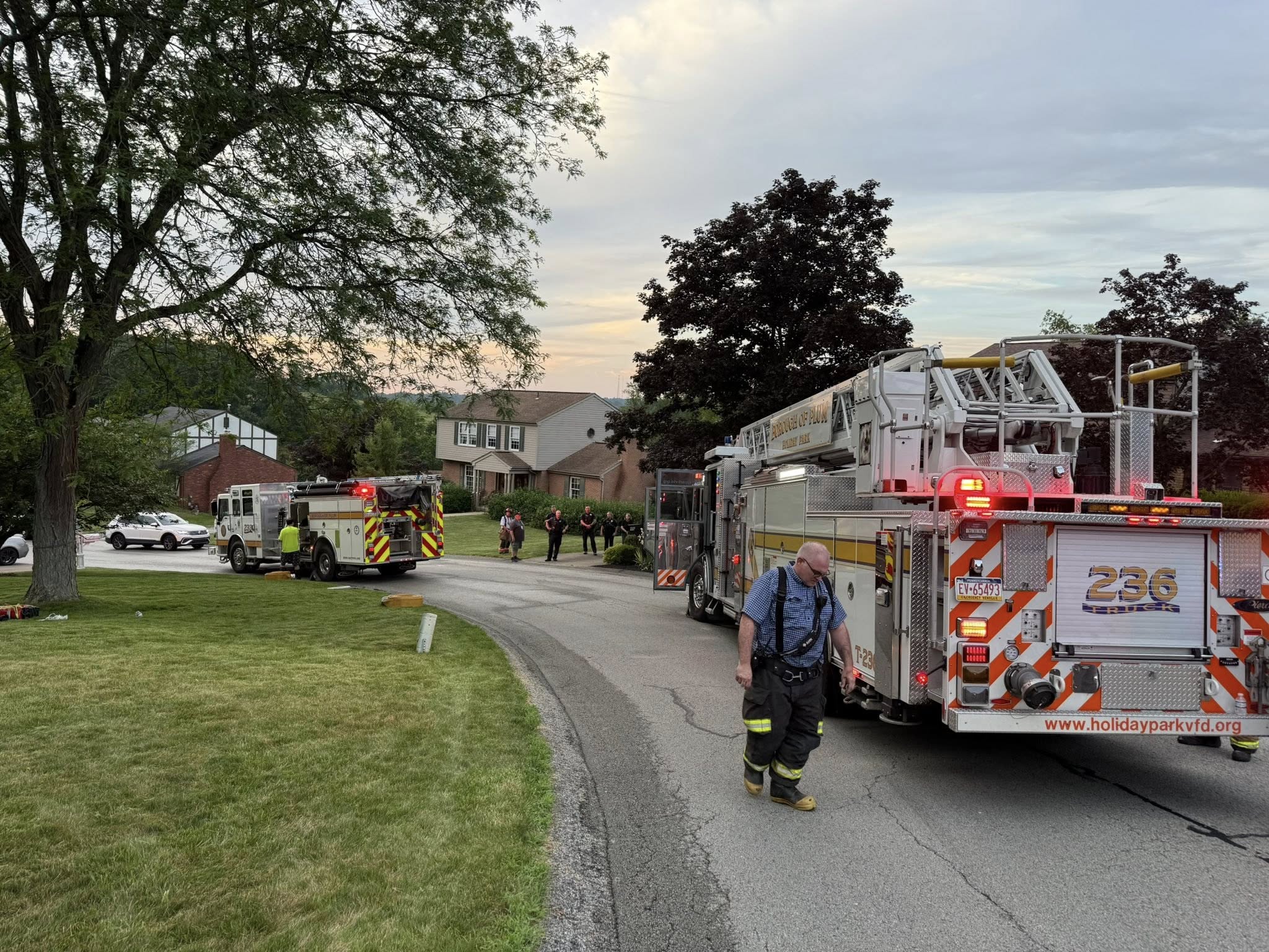 Sunday evening 236-Truck responded into the Unity section of Plum for a reported porch on fire on Greendale Drive. The first unit on scene reported a working fire and upon arrival of our ladder truck, the crew went to work with the fire units from seven other fire stations.