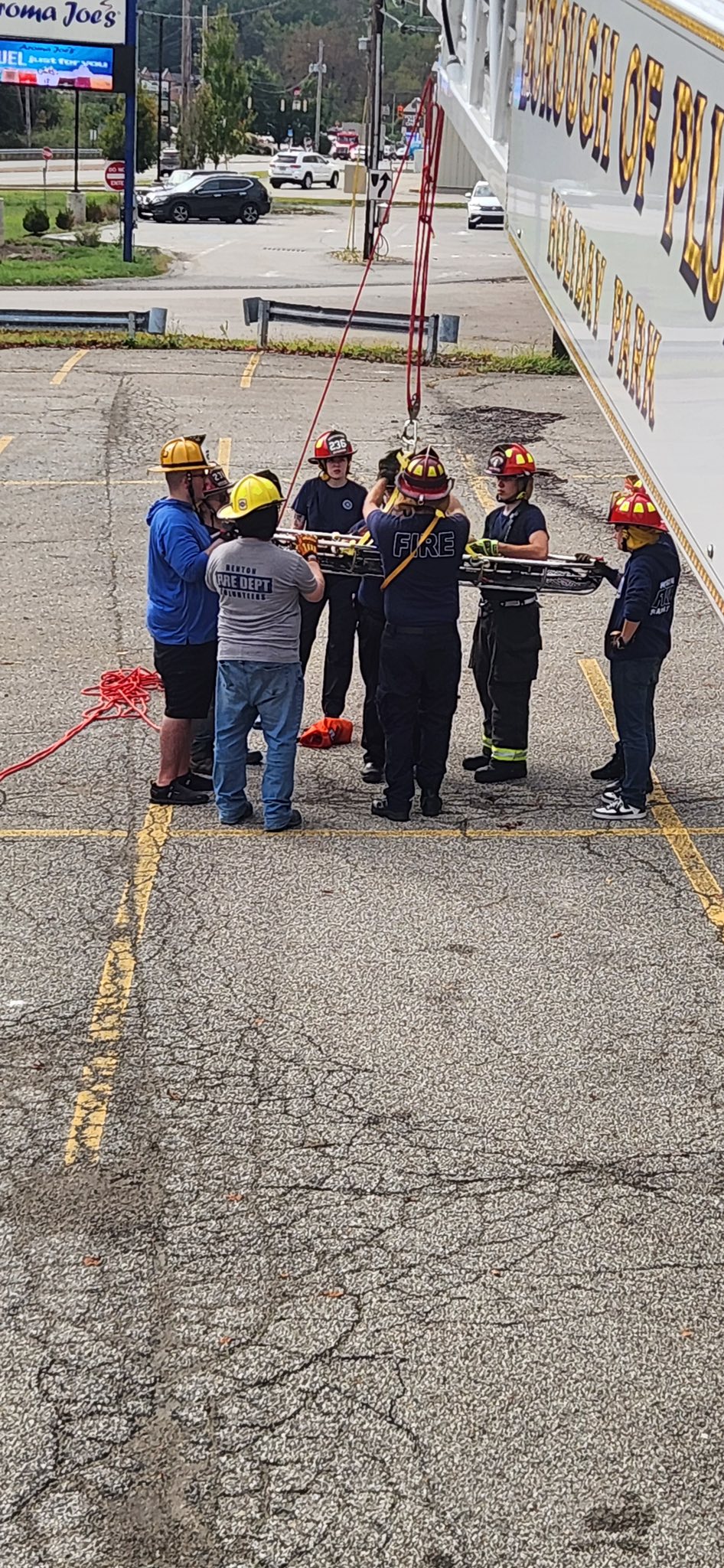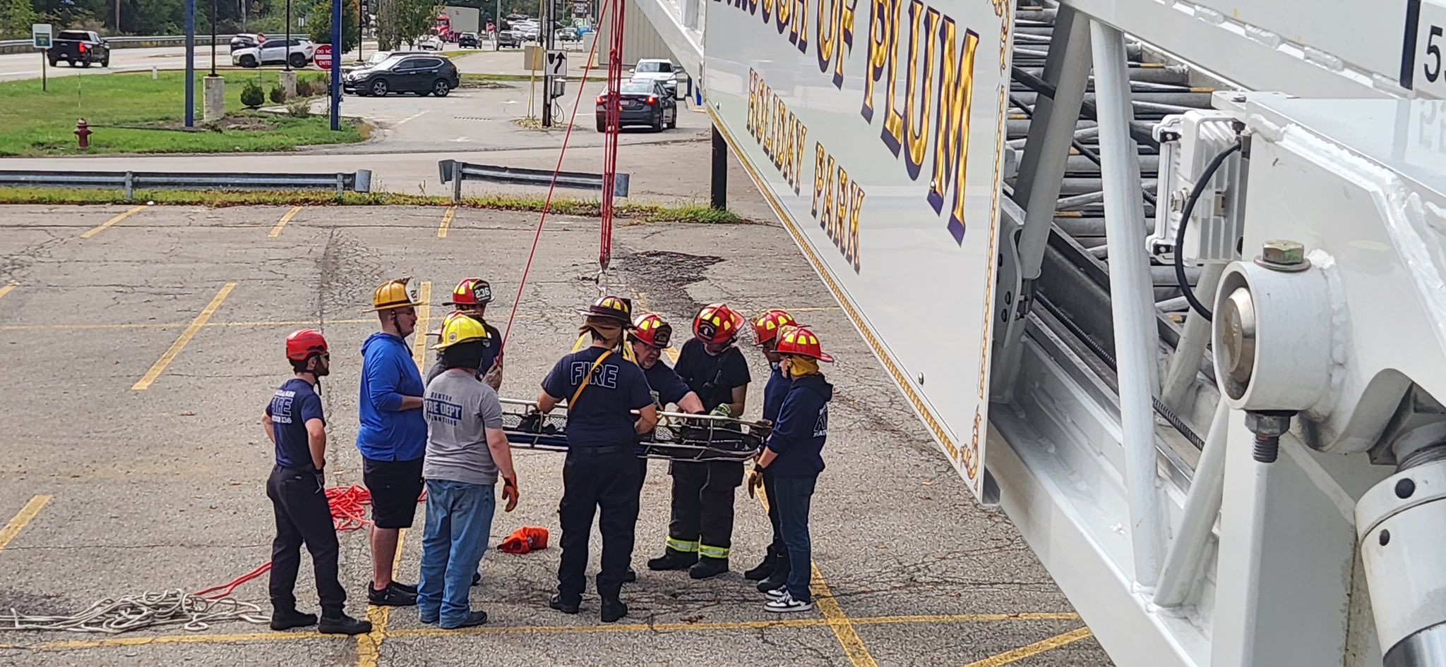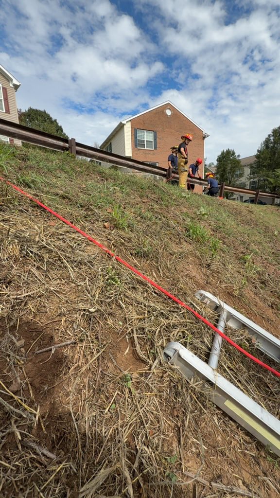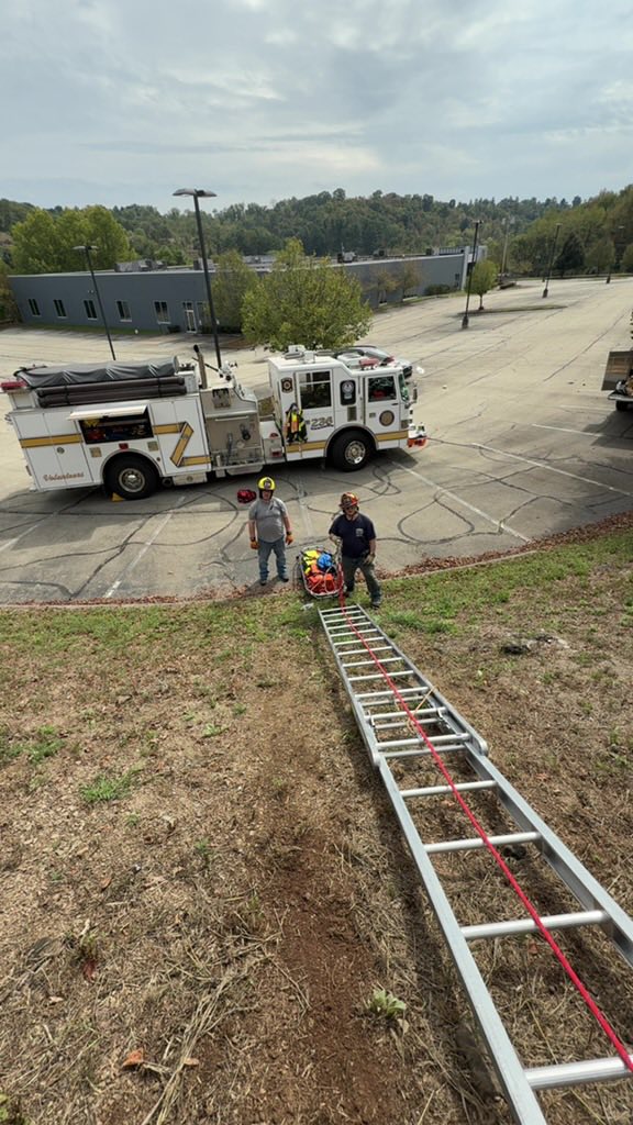 Then crews worked on making a Z system Pully using the back of 236-Rescue. Firefighters then performed a rescue evolution on a hill side using a Z pully system anchored to a guard rail and then utilized a 24ft ladder to rescue a victim on the hill to slide the stokes basket up the hill.