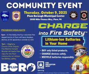 🔌🔋“Charge into Fire Safety™: Lithium-Ion Batteries in Your Home” is theme for Fire Prevention Week: this year’s focus on lithium-ion batteries works to better educate the public about how to buy, charge, and dispose of them safely. On October 9th, Plum Borough has a special community event to educate our citizens on this topic…