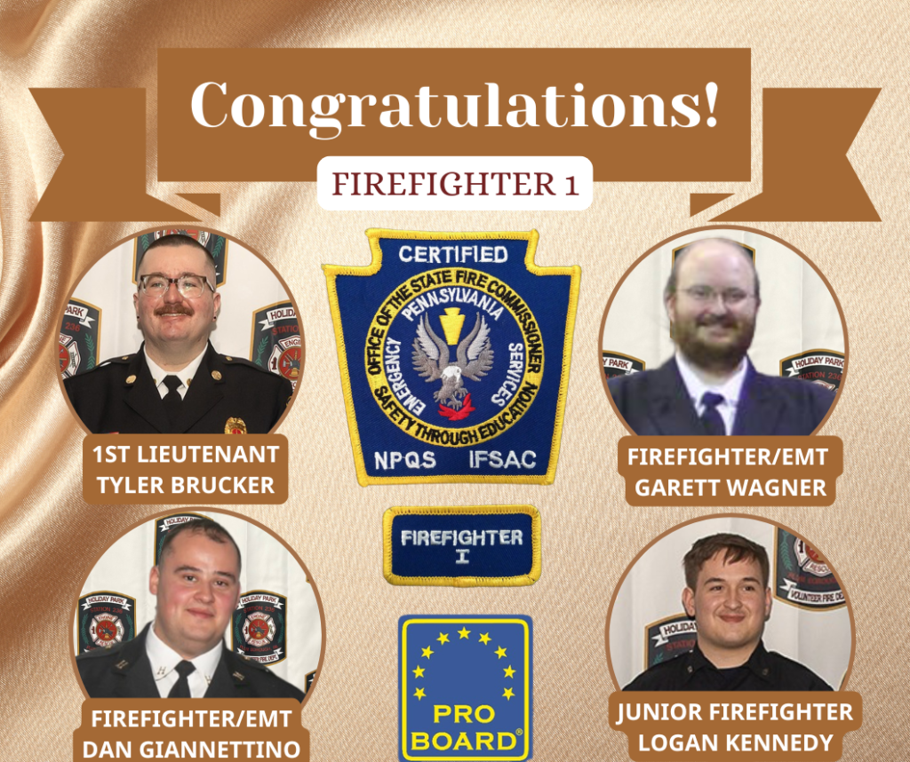 The officers & members of the Holiday Park VFD are proud to offer our congratulations to the following personnel on earning the National Firefighter 1 Pro Board Certification: