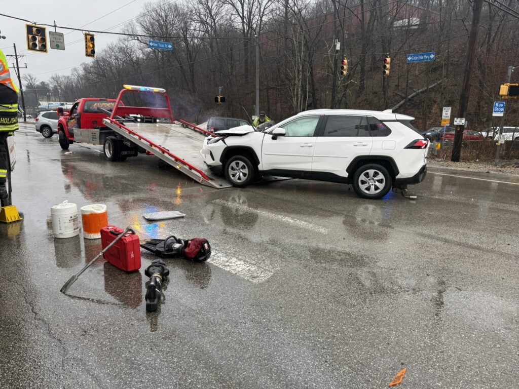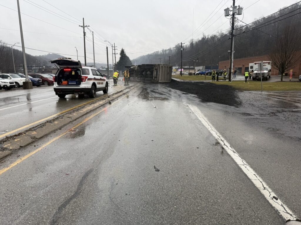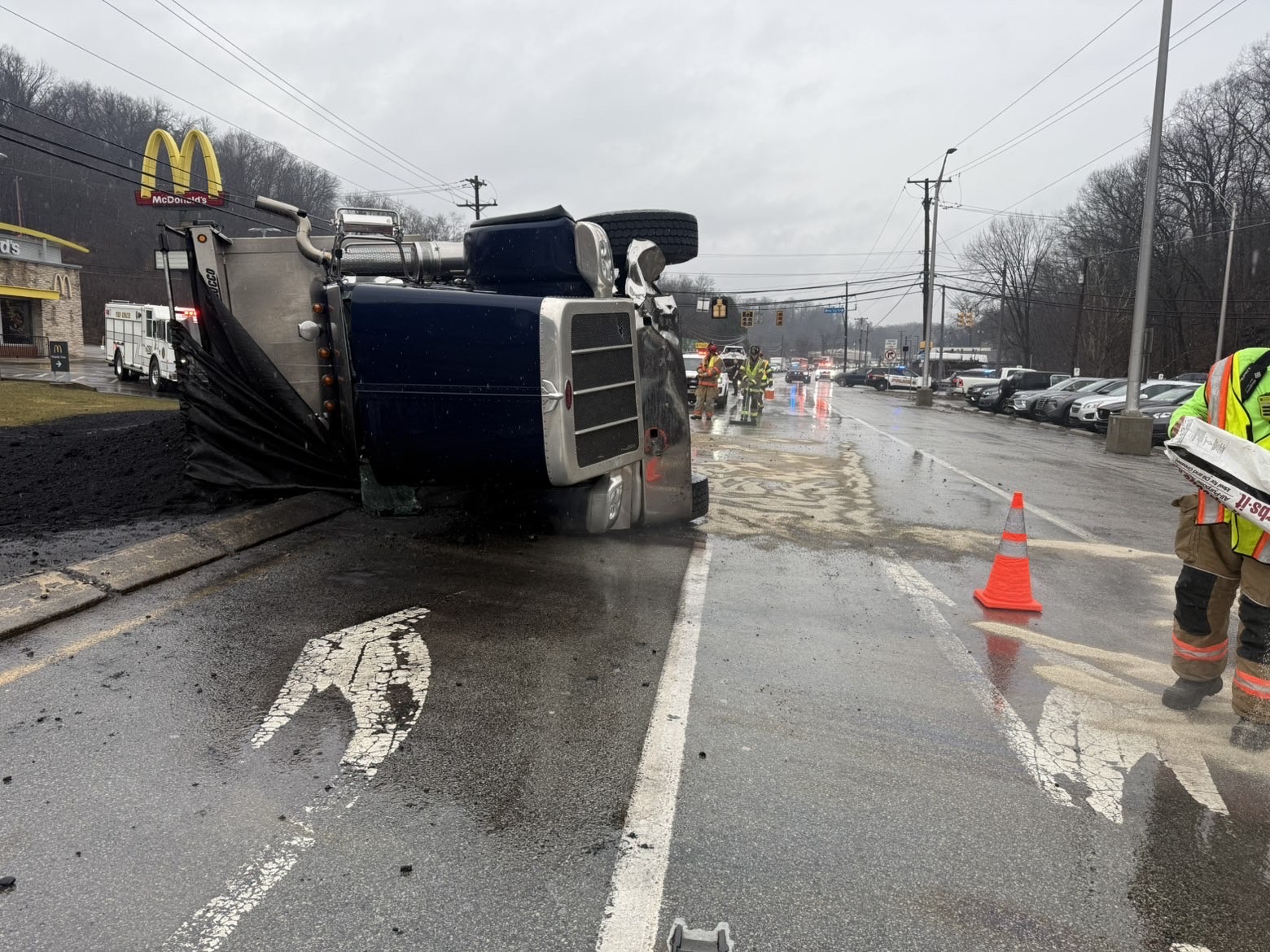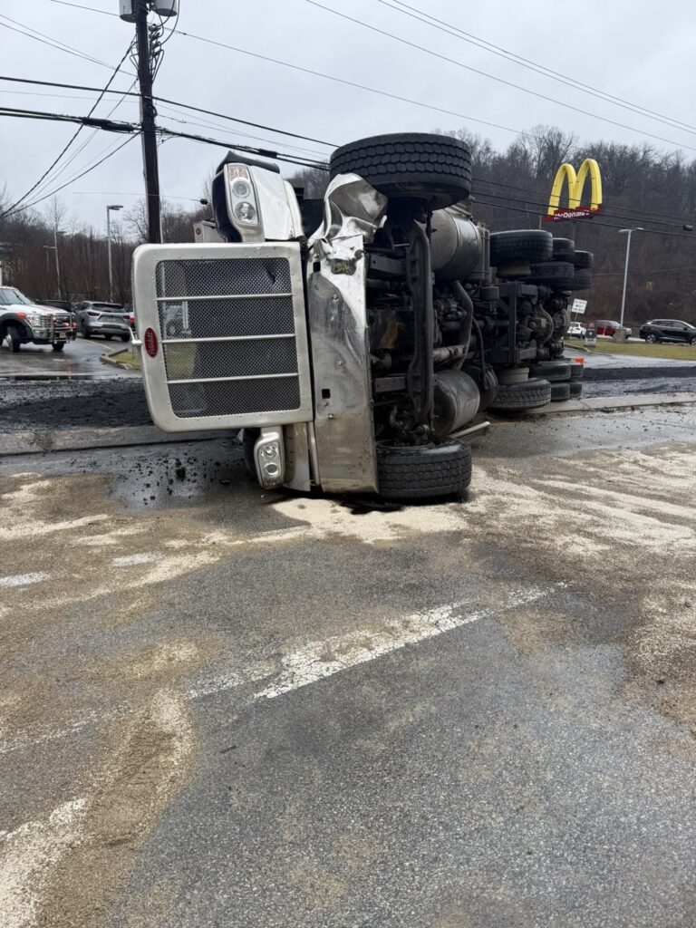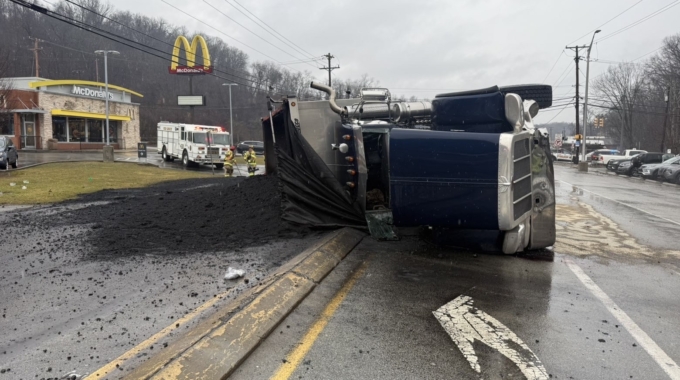 236-Rescue & 236-Chief responded to earlier today to a multi-vehicle accident involving a tri-axle truck on Golden Mile Highway in area of New Texas Road in Plum Borough. The truck was carrying a load of coal and in the course of the accident, the load spilled all over the roadway along with fuel.